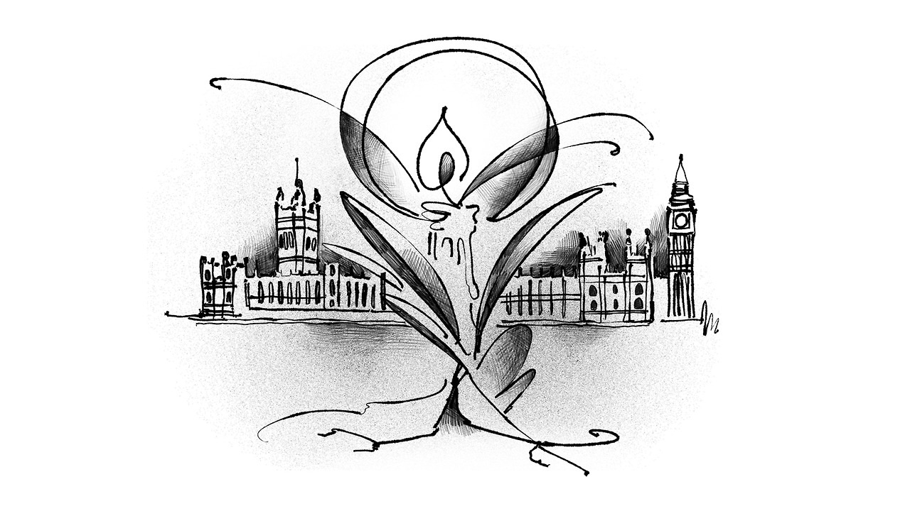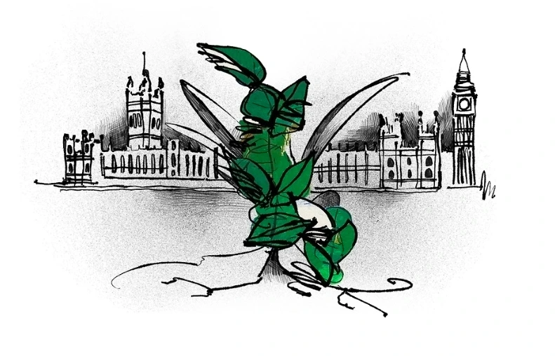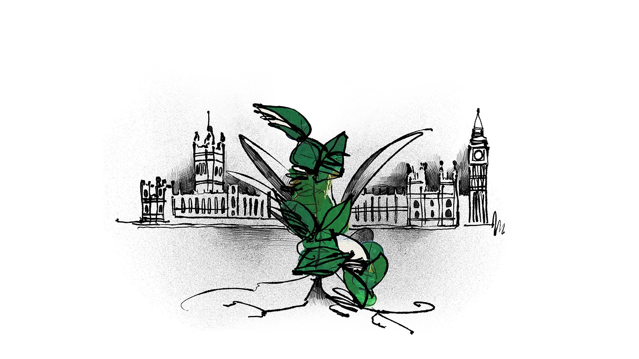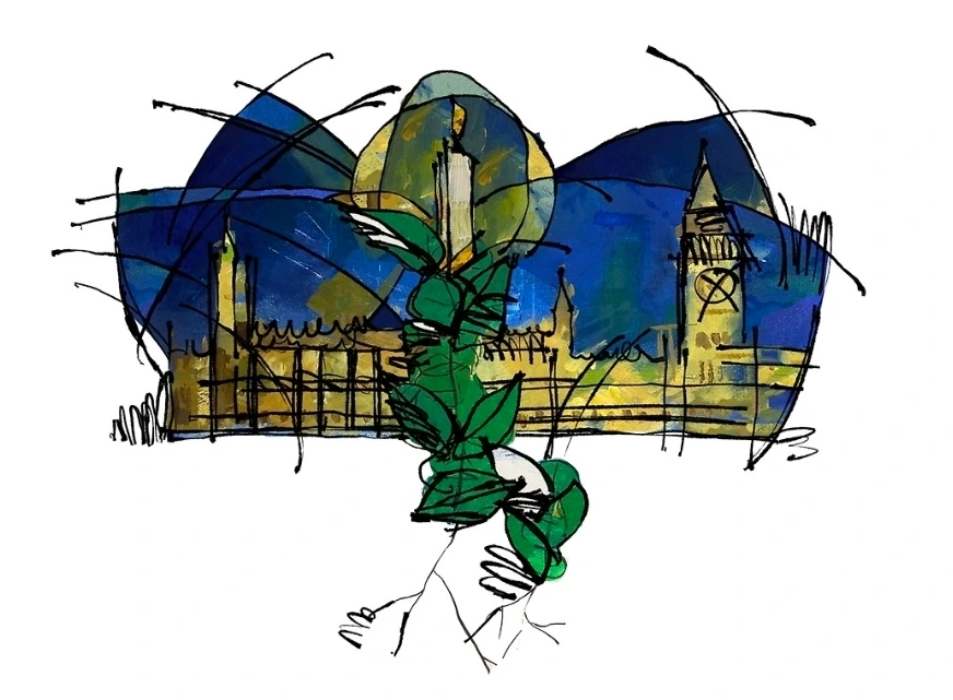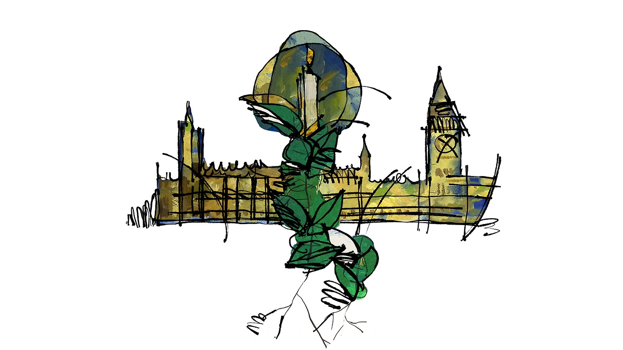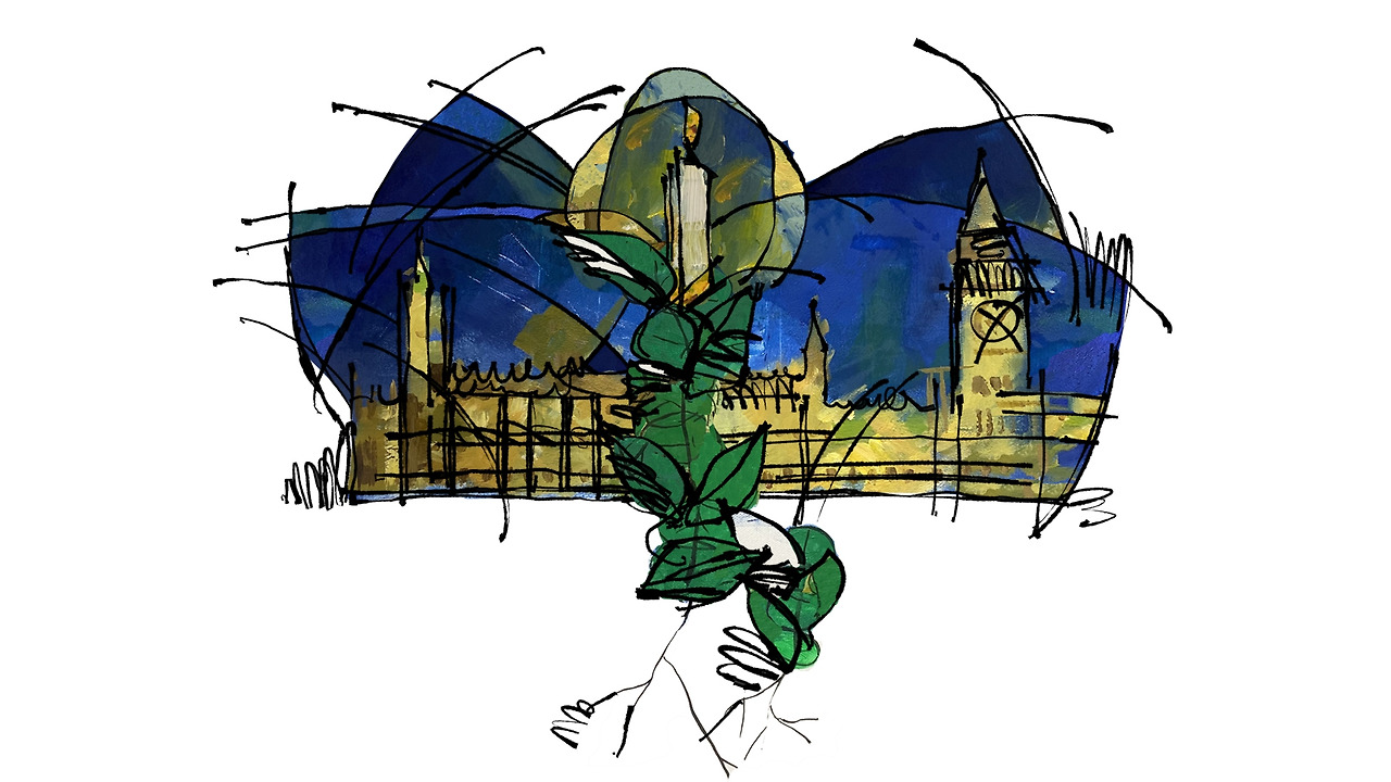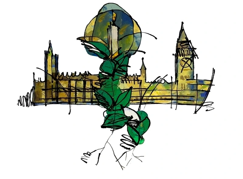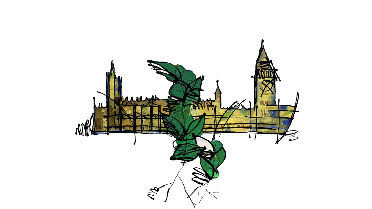 배경에 나타난 영국의 국회의사당.