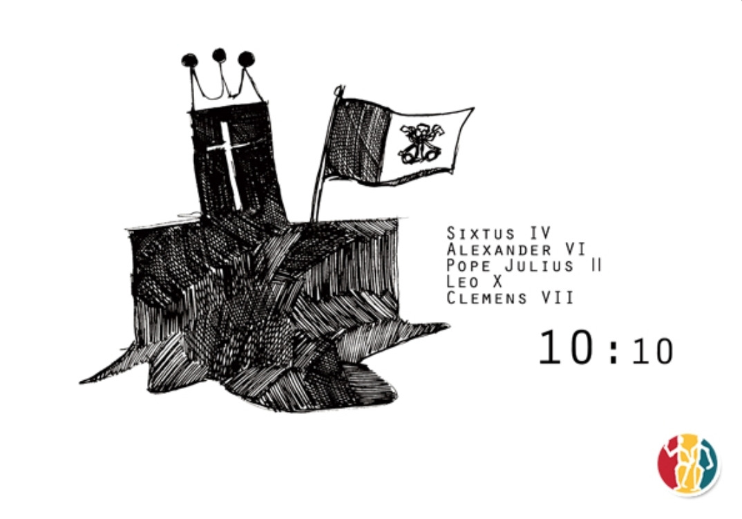 스케치 그림은 구두 모양의 이탈리아 반도에 교황 십자가가 걸린 표식에 왕관을 씌워 교회가 정치권력화 되어 나라를 지배하는