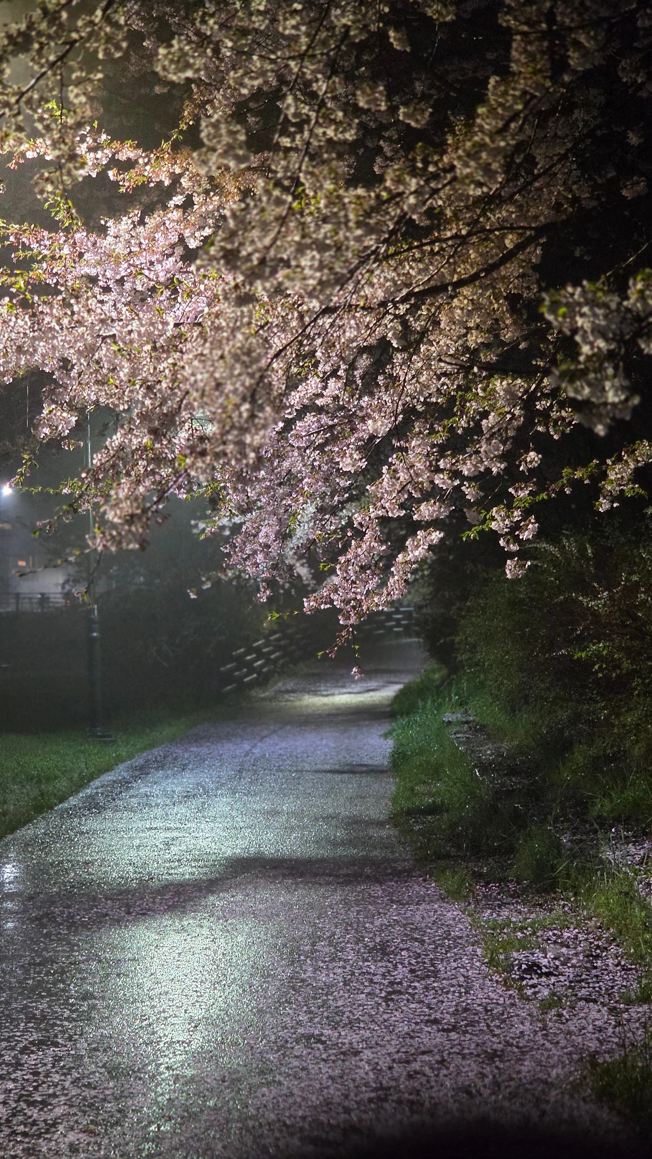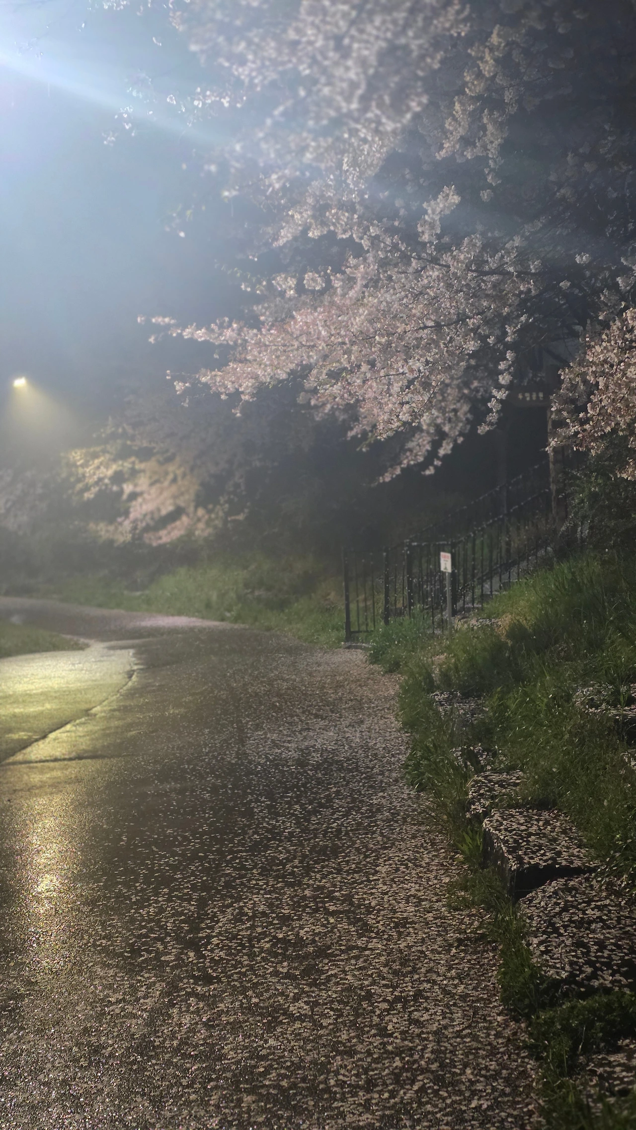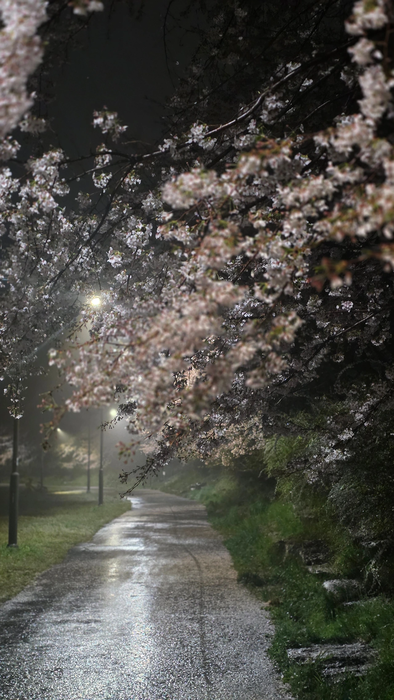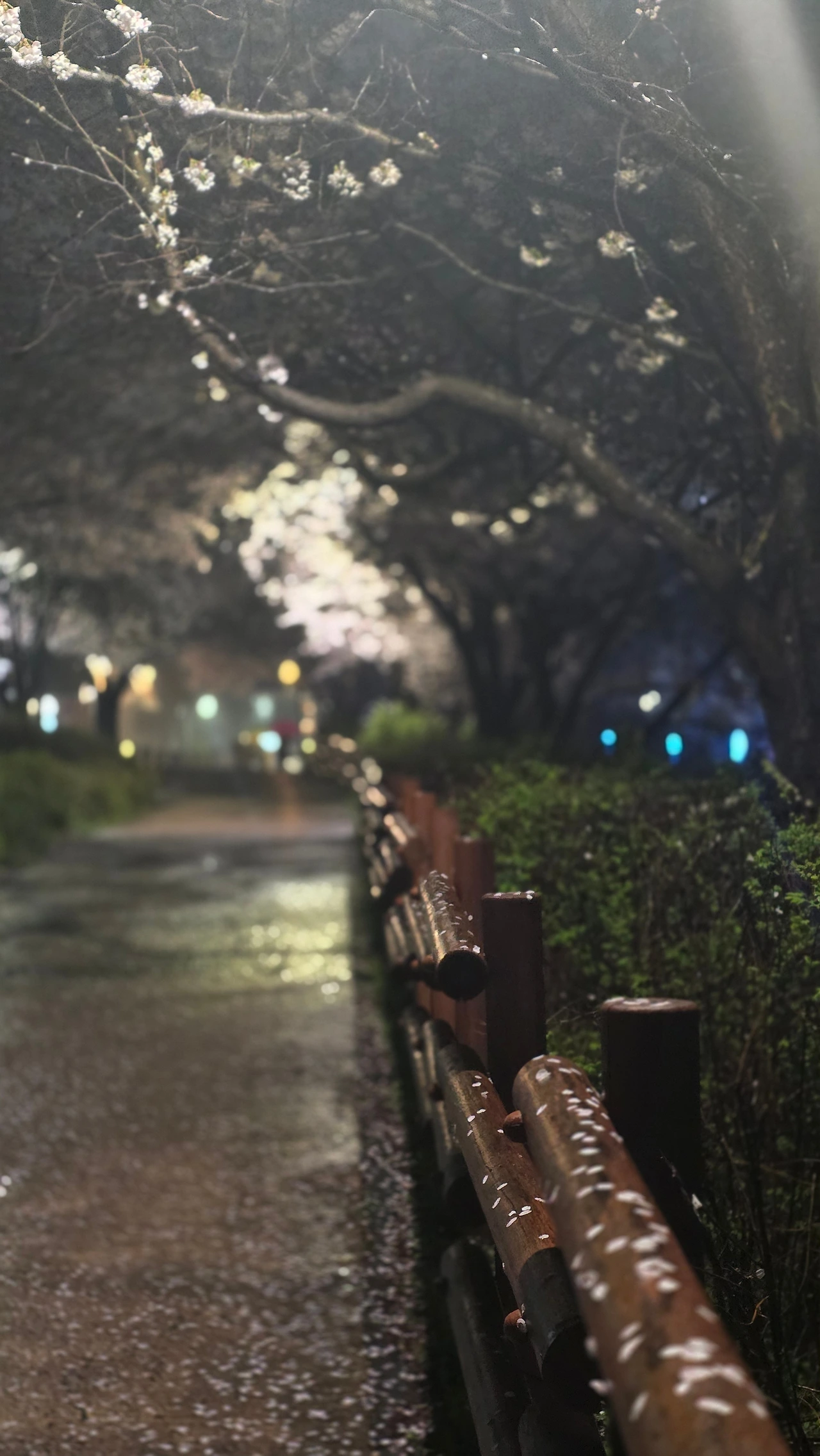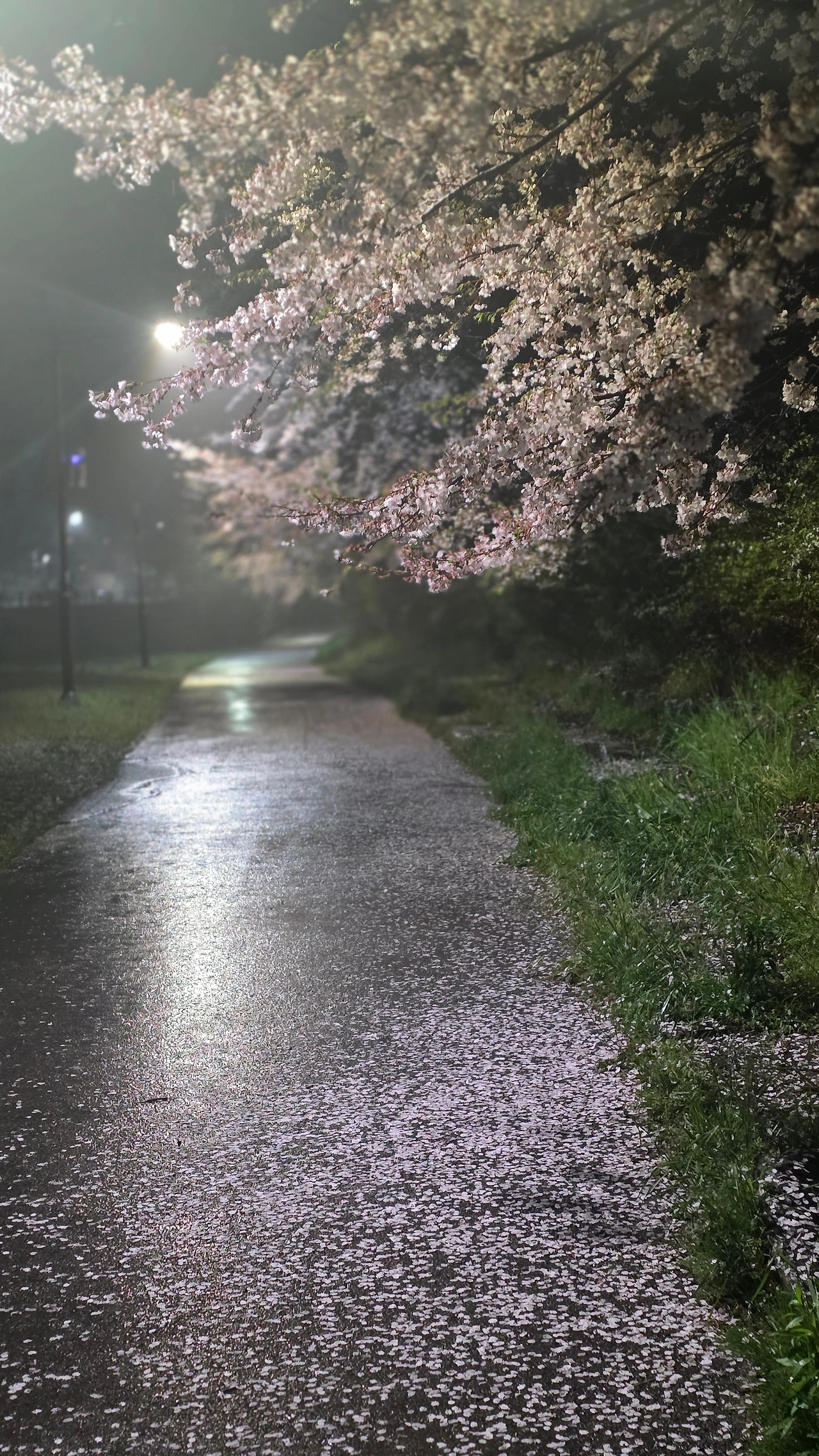 이내 비를 뿌려 벚꽃 잎을 땅바닥으로