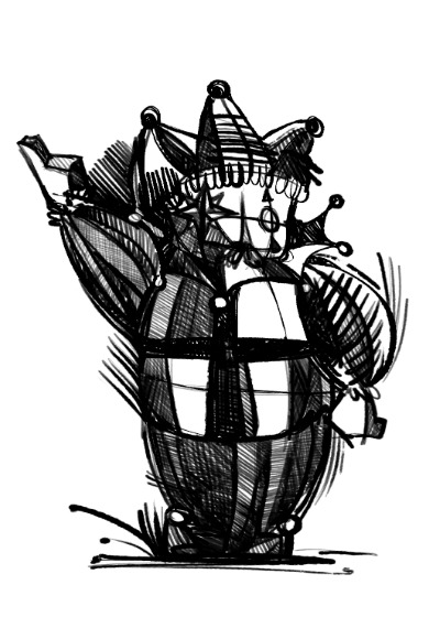 라페엘의 다채로운 색깔의 광대 옷과 나침판은