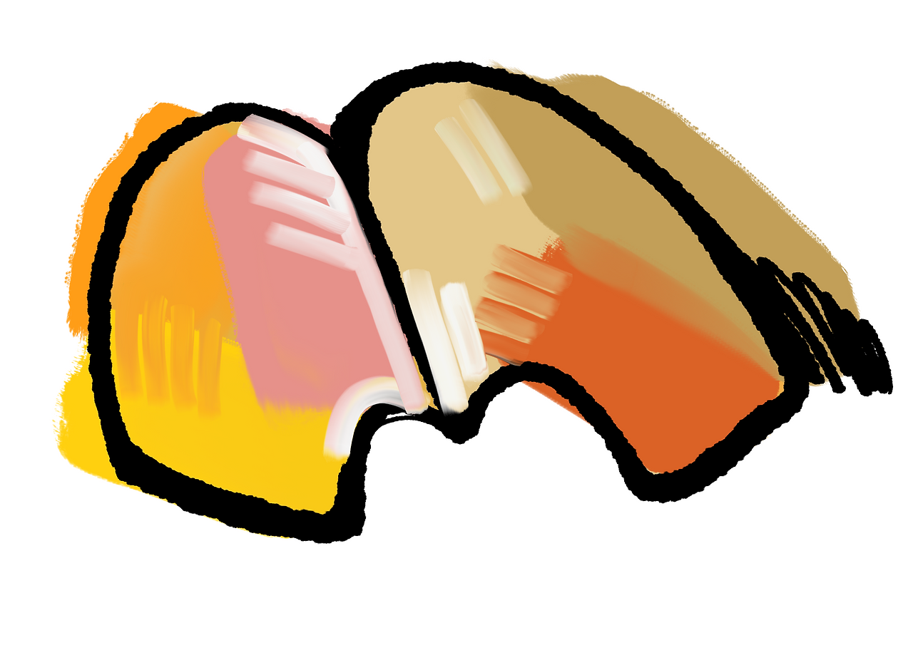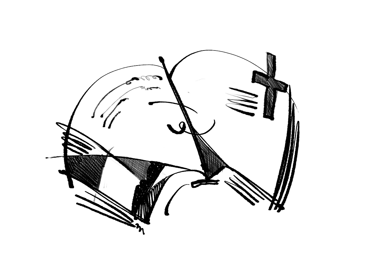 두 두상을 단순히 표현해서 서로 머리를 맞대고