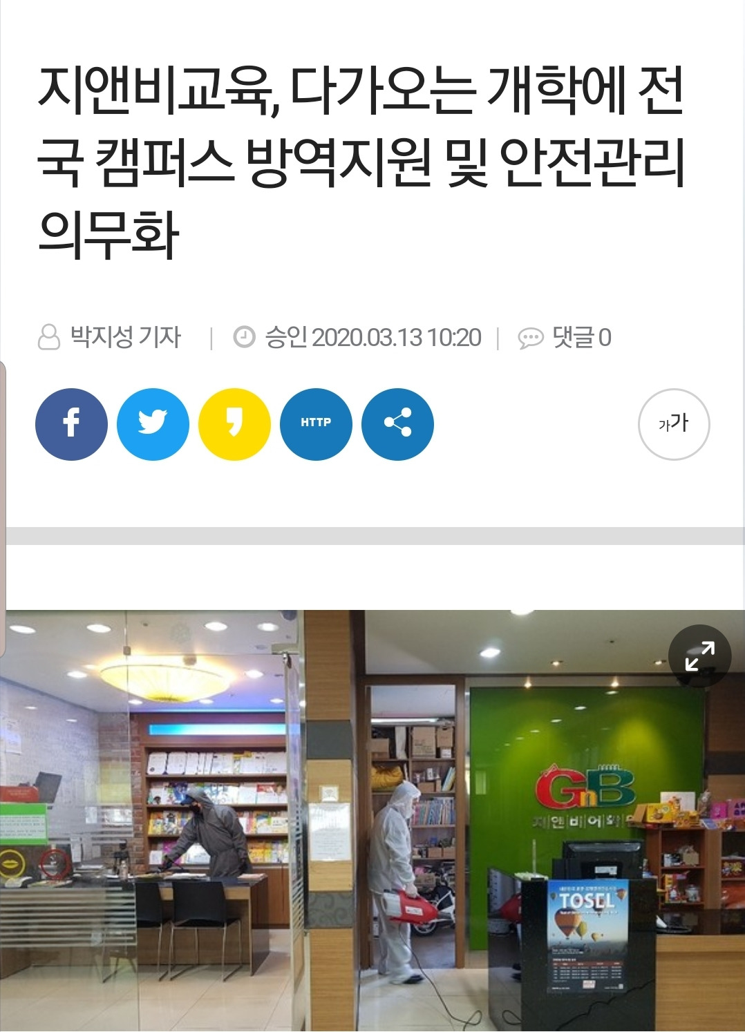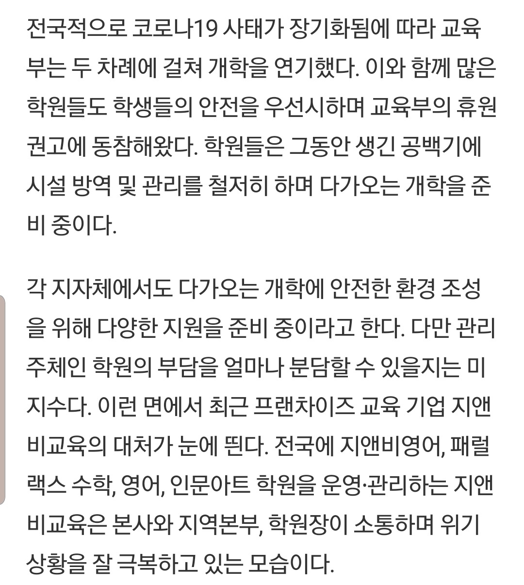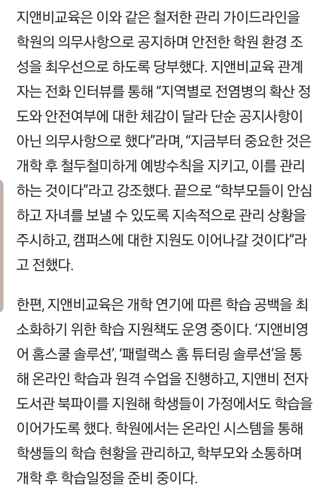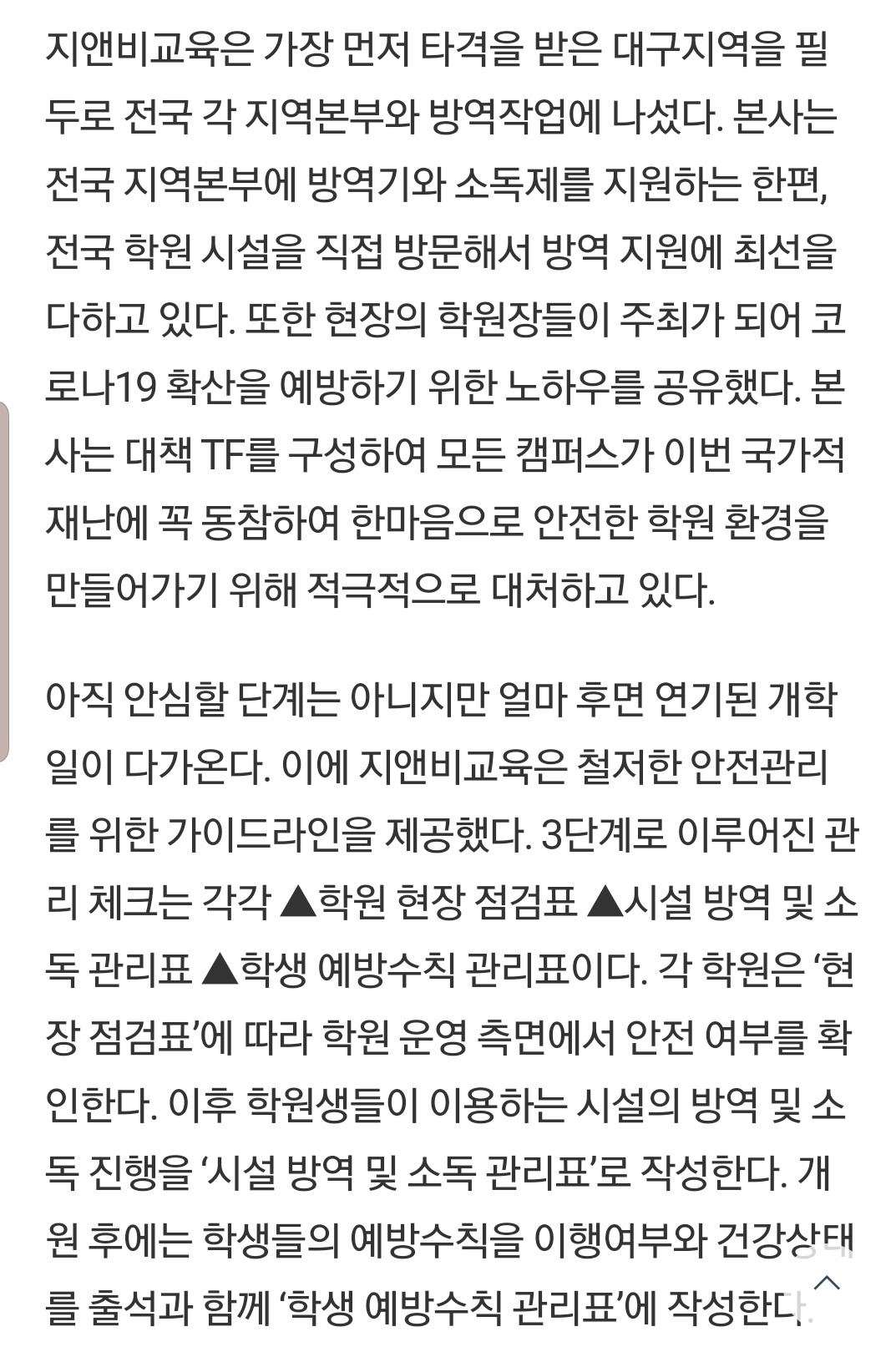지앤비 교육, 학원별 코로나 예방수칙 사전 점검 상시화