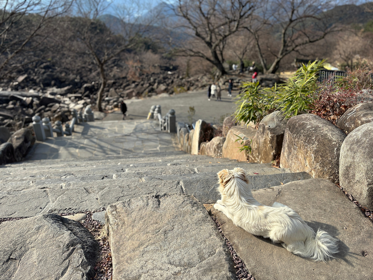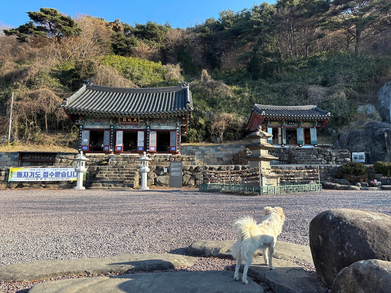 만어사 마당 한쪽에 있는 평상에 앉아서 산을 배경처럼 두른 전각들을 살펴본다. 만어사의 건물들은 이게 전부이다. 스님들의 거처인 요사채를 제외하고, 방문객들이 볼 수 있는 건축물은 4곳인데, 한 곳은 사진에 안 들어왔다. 외쪽부터 대웅전과 삼성각, 그리고 비교적 최근에 만들어진 아미타불, 그리고 사진에는 안 나온 미륵전. 이 건물들을 다 둘러보는 데에는 얼마의 시간이 안 걸린다. 그러니까 기다리면 여유로워진다. 마당 한편에 앉아서 기다려보자. 근데 오늘 날씨 좀 쌀쌀한 것 같다. 대웅전에 갈까 말까 고민하며 앉아있는데, 멍보살님이 어슬렁거리며 곁에 다가온다. 내가 계단을 올라 마당에 들어서면서 사진을 찍을 때도 '자, 나를 찍으라' 며 포즈를 취하시던 멍보살님.