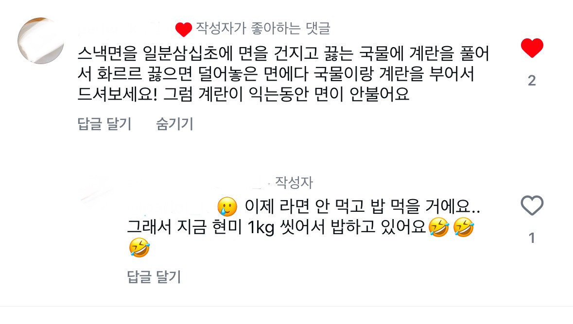 라면 봉지에 적힌 레시피보다 조금 덜 잡고, 권장시간보다 조금 덜 끓인 다음 면발만 건져서 그릇에 담아두고, 국물만 권장시간까지 끓여서 그릇에 부어먹으면 맛있는 라면이 완성된단다. 오호.. 내일 퇴근하고 다시 도전!이라고 외치고 있을 즈음 댓글이 하나 더 달렸다.