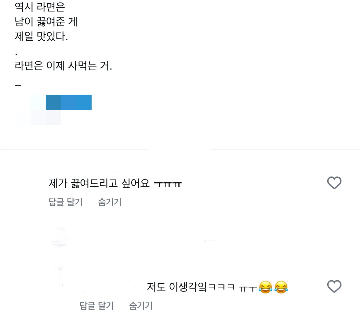 암튼 이 호사스러운 라면 먹방을 SNS에 자랑(?) 했더니 달린 댓글.