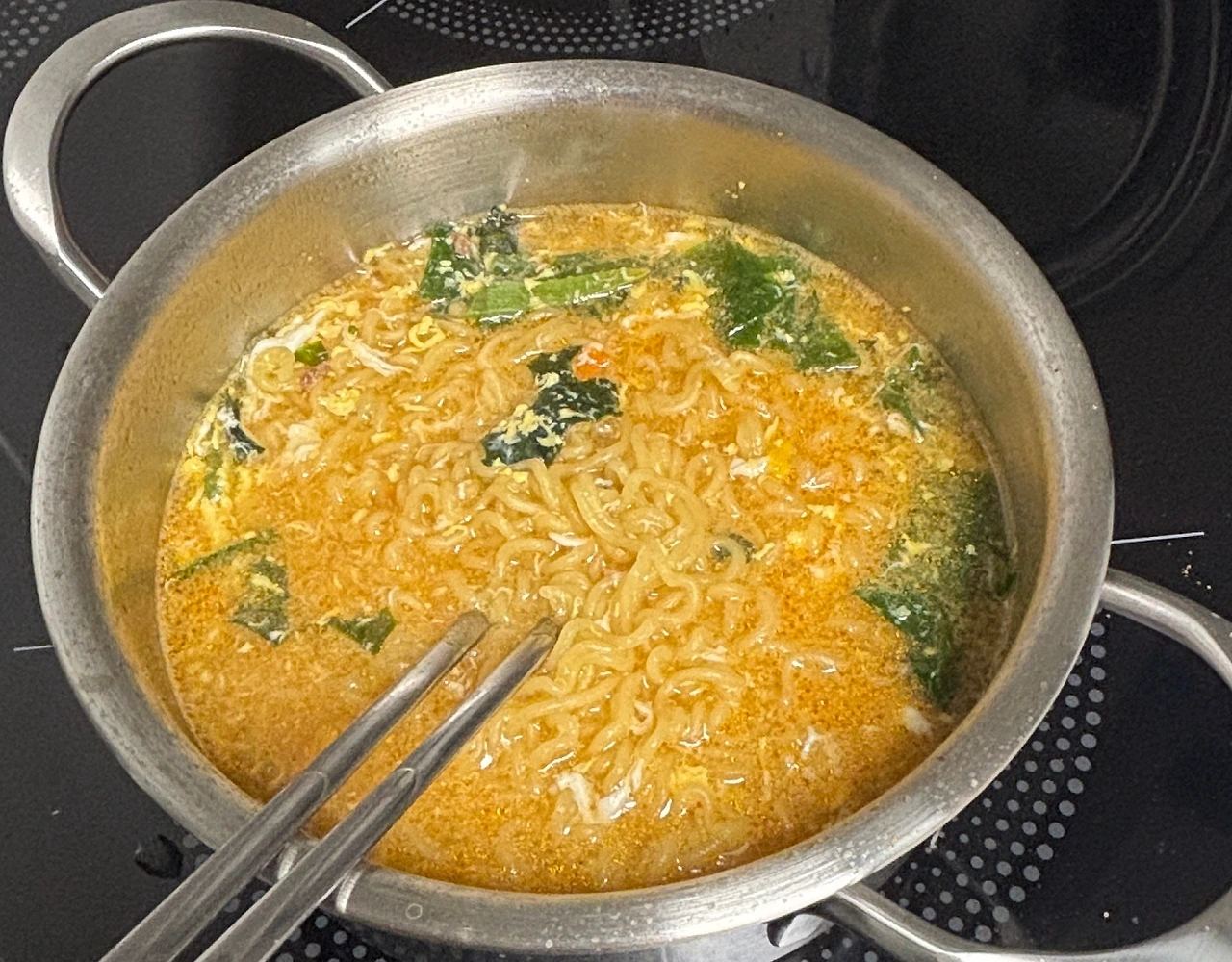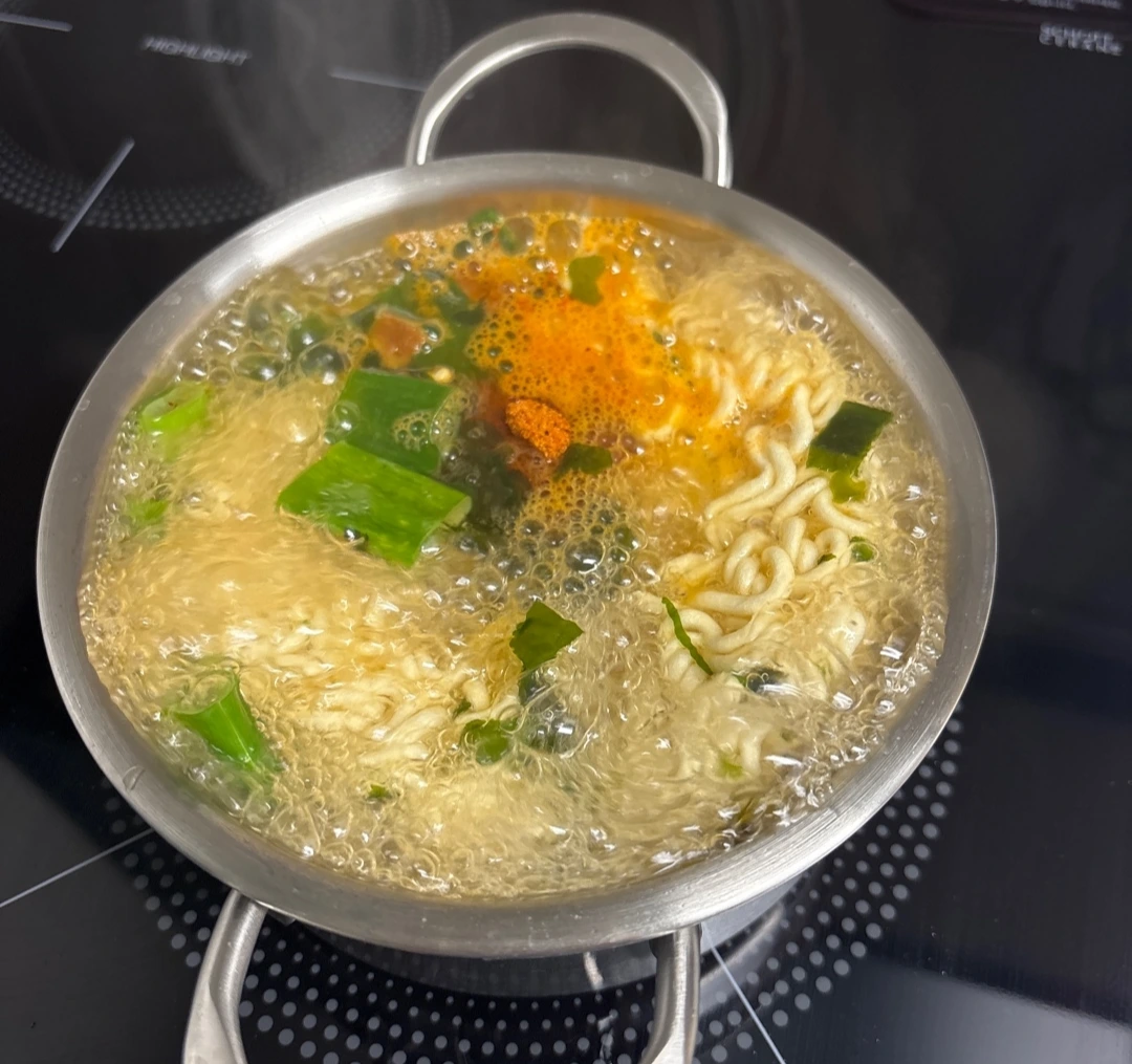 냄비에 비해서 물의 양이 많았던 건지, 사진을 찍는 동안 물이 넘쳤다(사진을 왜 찍니.. 이러니까 라면을 못 끓이지..). 넘친 물을 닦느라 타이머를 설정을 못해서, 대충 5분쯤(?) 되었을 때에 불을 껐다. 참, 끓이는 중간에 계란도 하나 넣었네. 물이 좀 많은 것 같기도 하고, 나는 라면에 계란 들어간 게 맛있으니까 계란을 풀어줬다. 그렇게 완성한 너구리.