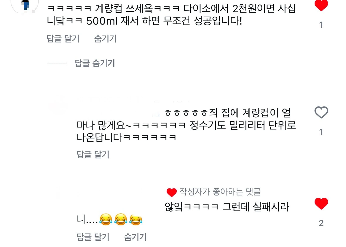 계량컵을 쓰면 라면 물 맞히기가 쉽다는 조언이 달렸다. 하하하하하하. 우리 집에 계량컵 정말 많다. 이 집에 이사 오는 날 바로 다이소에 가서 계량컵을 샀다. 그리고 계량컵과 계량스푼 공구도 얼마나 많이 했는지 모른다. 집 정수기도 120ml, 250ml 계량되어서 나오는데, 그것도 혹시나 하여 계량컵에 받는다. 이렇게 내가 철저하게 물의 양을 잡는데도 늘 물이 많은 건, 내가 안 보는 사이에 귀신이 물을 붓는 건가..