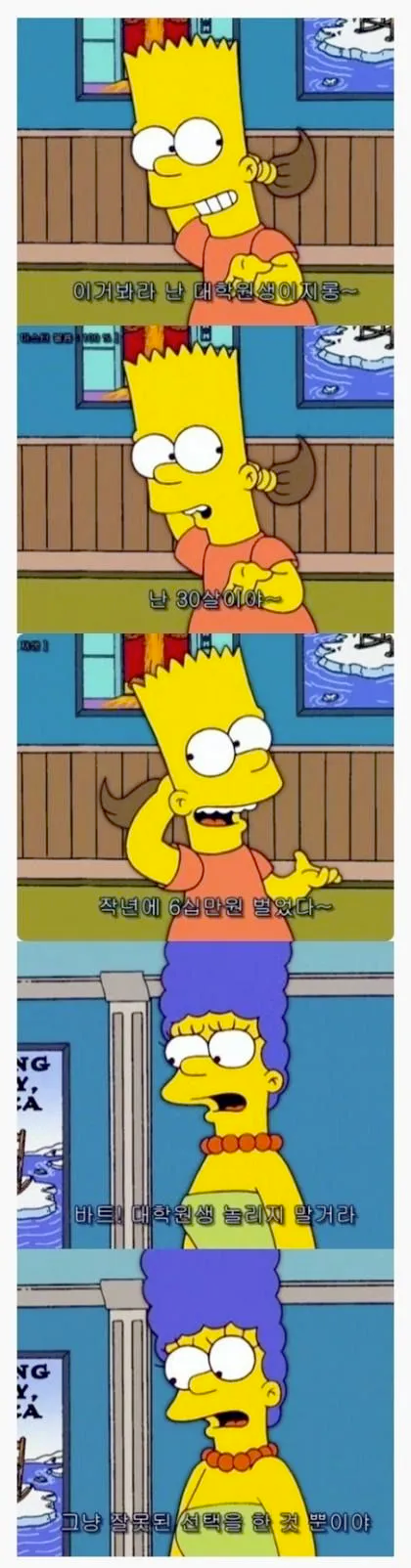 또 유명한 밈 중 하나가 심슨 가족에서 바트가 대학원생을 놀리는 장면이다. 바트가 서른 살인데도 작년에 60만 원 벌었다고 이야기하자, 엄마 마지가 “대학원생을 놀리지 말거라. 그들은 그냥 잘못된 선택을 한 것뿐이야.”라고 말한다. 아.. 마지의 말에서 눈물이 핑 돌 뻔했다. 남일 같지 않아서 말이다.