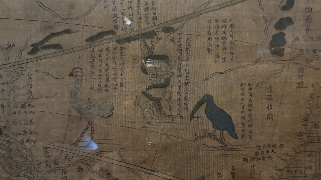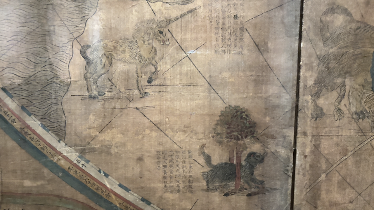 전시관 입구는 곤여전도와 그 지도에 등장하는 신기한 동물들을 복원한 영상을 계속해서 보여준다. 오우.. 기술 참 좋아졌네,라는 세상 다 산 늙은이처럼 읊조리고 입장. 역시나 사람이 별로 없다. 내가 기대했던 바(학예사 선생님은 눈물을 흘리시겠지만..). 쾌적하게 전시실을 누비며 곤여전도를 구경했다. 설명 패널을 읽고, 지도의 그림을 하나씩 보고, 옆에 적인 글자는 대충 읽고 -한문이었다. 그것도 아주 긴.. 이거 번역 좀 해서 같이 전시해 주시면 안 되나요?? - 음음.. 하면서 말이다.