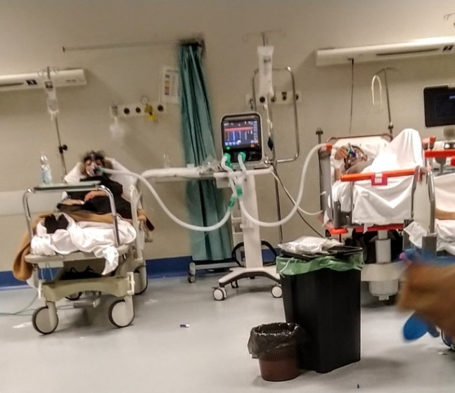 인공호흡기 가 부족해 한 개로 두 사람이 동시에 사용하고 있다.