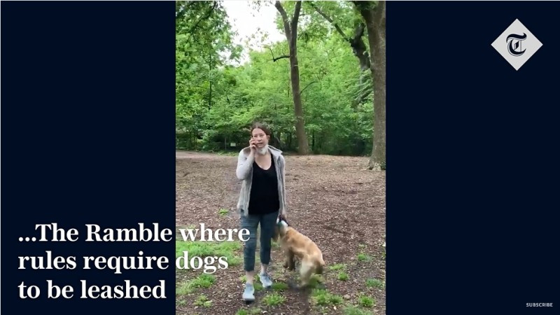 센트럴파크에서 목줄 없이 개와 산책 중이던 백인 여성에게 흑인 남성이 공원 규정대로 개 목줄을 채워달라고 정중하게 요구. 이에 백인 여성이 911에 '흑인으로부터 생명 위협을 당하고 있다'라고 허위 신고. 이 모습을 흑인 남성이 고스란히 촬영해 온라인에 공개됨.