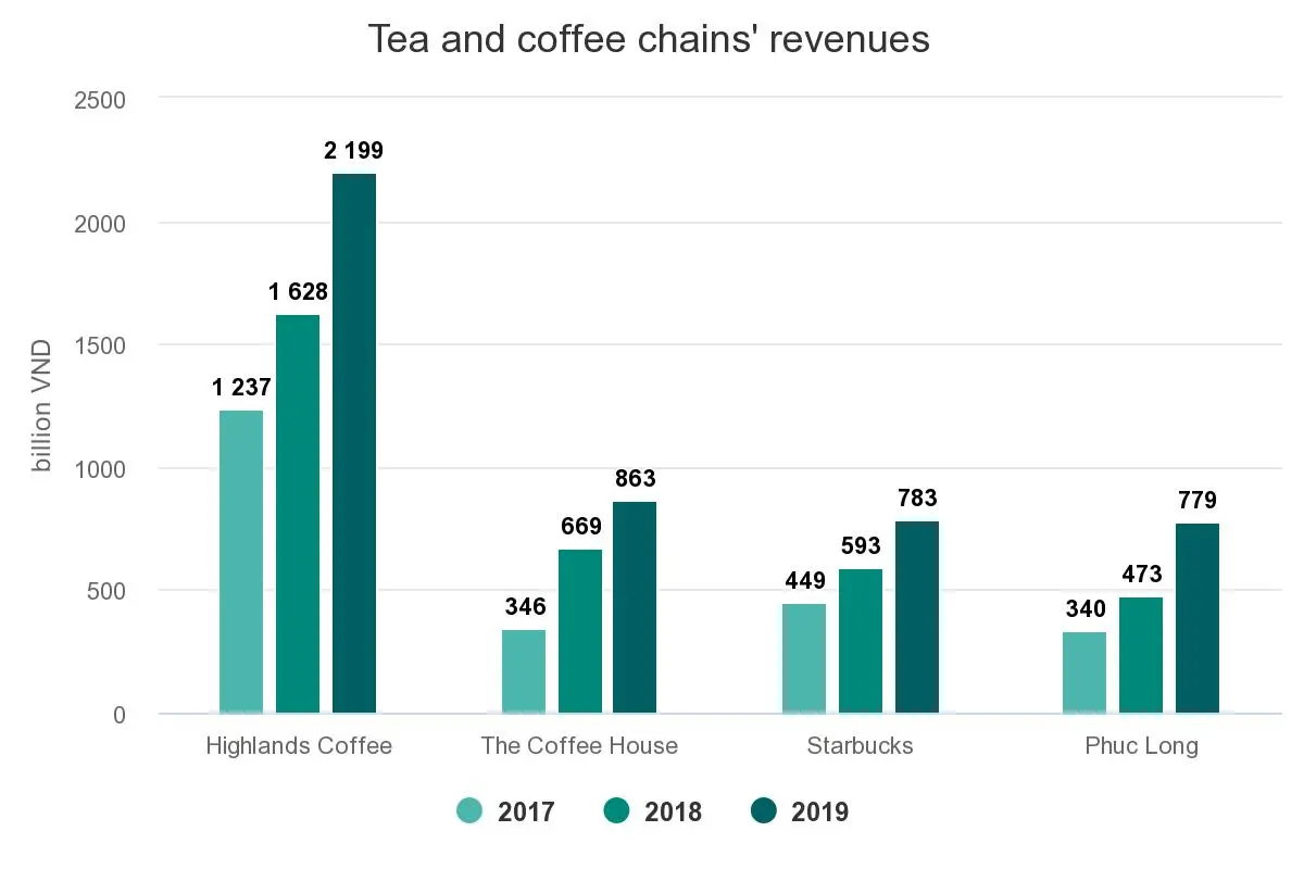 시장 조사기관 유로모니터에 따르면 스타벅스는 2019년 783억동의 (한화39억원) 매출을 기록하며 4등과 3백만원 차이로 베트남 전체 커피 체인점 시장에서 아슬아슬한 3위에 랭크 되었다. 글로벌 커피 공룡 스타벅스이지만 2020년 12월 현재 67개 매장을 운영하며 베트남에서 분투하고 있다.