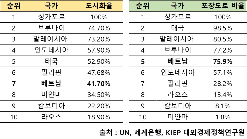 2000년 24.4%, 2011년 31.1%였던 베트남 도시화율이 2022년 41.7%으로 처음으로 40% 대에 진입했다. 하지만 베트남은 아세안 10개국 중 도시화율은 7위로 빠르게 발전하는 국가 경제 규모에 비해 아직도 도시화율이 저조하다. ‘급속한 도시화가 경제적 효율성과 빠른 경제 성장을 가져온다’는 폴 로머 교수의 이론에 따르는 듯 베트남은 도시화율에 더욱 박차를 가하고 있다. 베트남 정부는 2025년까지 도시화율을 45%, 2030년까지 50% 달성을 목표로 내걸었다.