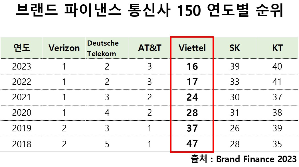 최고 500대 브랜드 중 아세안 기업 중에서는 유일하게 5년 연속 글로벌 500대 브랜드에 선정된 곳이 있는데 Viettel_비엣텔이라는 베트남 통신사이다. 비엣텔은 2019년 처음으로 브랜드 가치 세계 482위에 선정되었고 2020년 356위, 2023년에는 234위로 해마다 가파르게 브랜드 가치가 상승하고 있다. 비엣텔의 글로벌 통신사 카테고리에서의 순위는 16위로 한국의 양대 통신사인 SKT (39위), KT (40위) 보다 순위가 앞도적으로 높다. 불과 5년 전인 2018년에는 비엣텔이 48위였고 SKT가 28위였는데 몇 년 사이에 순위가 완전히 뒤바뀌었다.