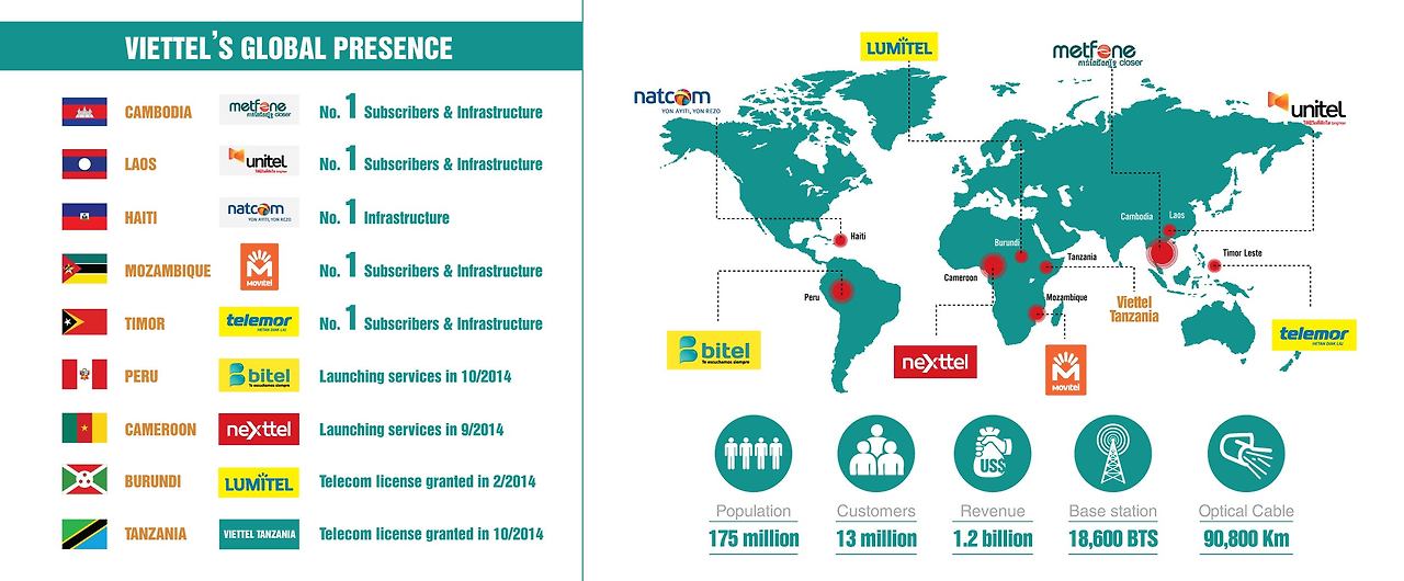 그런데 놀랍게도 수 년 째 아세안 최고 브랜드로 평가 받고 있는 비엣텔은 민간 기업이 아닌 베트남 국방부가 소유한 군대 기업이다. 게다가 인근 아세안 국가인 미얀마, 라오스, 캄보디아는 물론 중남미의 페루, 아이티, 아프리카의 모잠비크, 부룬디 등 전 세계 10개 국가에 진출해 있고 그 중 5개 국가에서는 시장 점유율 1위이다. 2022년 비엣텔의 연결 매출액은 68억 달러로 한화 9조원이며 이중 해외 매출은 30억 달러 약 4조억원이다. 최근 한국의 KT가 아프리카 르완다 진출 10년간 2500억원의 누적 적자 늪에서 헤어나오지 못하고 있다는 소식이 보도 되었다. 그런데 베트남 기업 그것도 국방부 소유의 군 기업인 비엣텔은 모잠비크, 부룬디, 탄자니아, 카메룬 등 아프리카 대륙 4개 국가에서 훌륭한 성적을 거두고 있다.