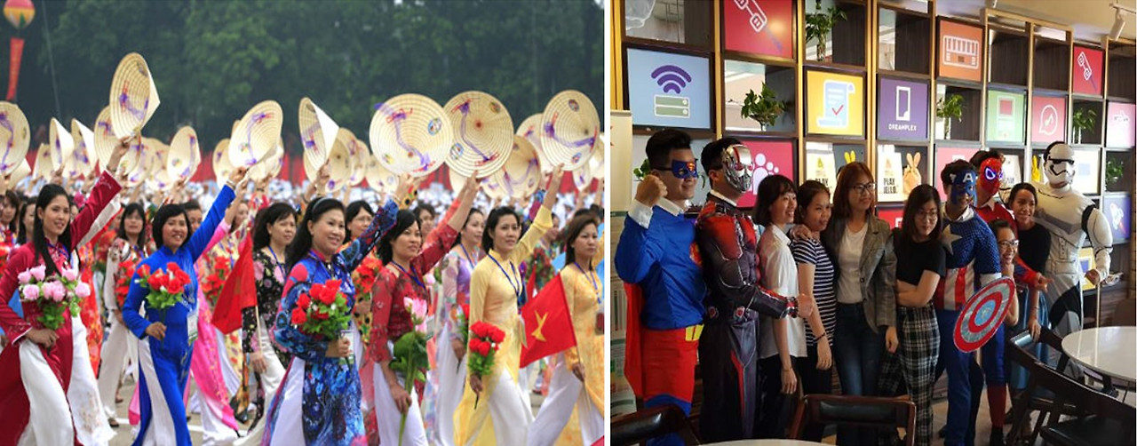 베트남에서 세계 여성의 날은 큰 축제입니다. 회사 남자 직원들은 동료 여성 직원들에게 여성의 날을 축하하는 꽃을 선물하고 축하 케이크를 사서 함께 여성의 날을 기념합니다. 베트남은 1930년 10월 20일 여성연합이 결성된 것을 기념해서 10월 20일은 베트남 여성의 날로 별도로 지정해서 두 번의 여성의 날을 기념합니다. 요즘은 남자 직원들이 다양한 아이디어로 코스프레 분장으로 신나고 재미있게 여성의 날을 축하기도 합니다.