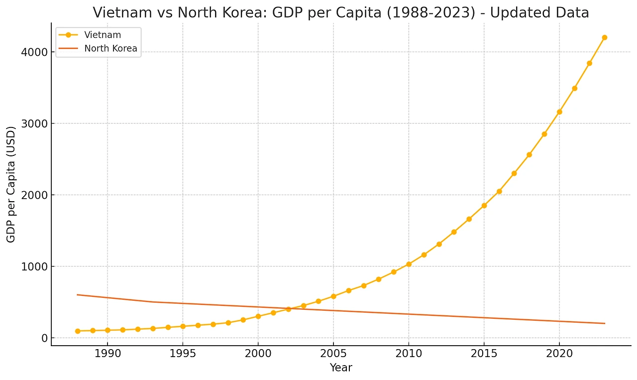 지난 30년간 연평균 성장률 6~7%의 고성장을 이룬 베트남과 달리 북한은 1988년 1인당 GDP 1000 달러 내외에서 2023년 현재는 500달러 미만으로 추락한 것으로 추정된다. 2018년 6월 싱가포르에서 열린 1차 북미정상회담 직후 당시 폼페이오 미국무부장관이 평양을 방문하고 곧바로 도착한 하노이에서 ‘북한이 미국과 관계 개선을 한 베트남식 개혁개방을 따르면 ‘기적’같은 경제 성장이 재현될 것’이라고 말했다. 북한과 미국 모두 베트남식 개방 모델에 합의한 것이었다.