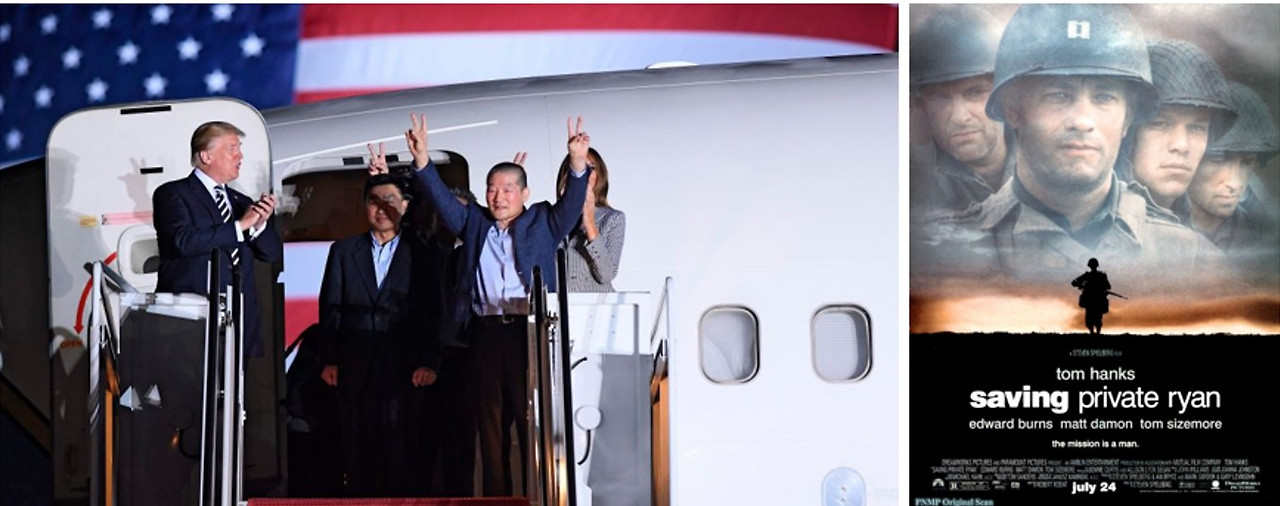미국 영화의 핵심 흥행 코드는 언제나 '애국주의'와 '가족 사랑'인데 이번에 북한에서 석방된 억류자들이 딱 이 주제에 들어맞는다. 람보, 라이언 일병 구하기를 대표로 하는 '단 한 명의 우리 국민도 포기하지 않는다'를 여실히 보여준 실화이니 이 절호의 기회를 트럼프가 놓칠리가 있겠는가