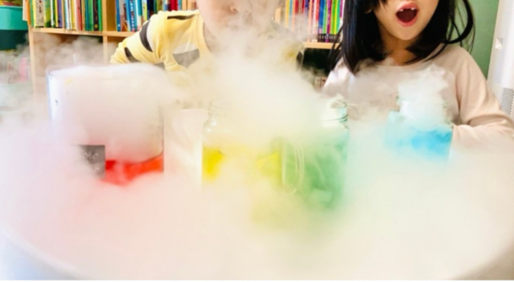 각 물통에 드라이아이스 조각을 넣으니 신비한 힘을발휘하는 마법약처럼 연기가 자욱히 생기네요. 드라이아이스가 승화하면서 생기는 연기! 아이들은 신기해하면서 이쁘다고 하며 마구 불기 시작합니다. (혹시나 모를 이산화탄소 중독에 대비하여 환기하면 좋습니다.)