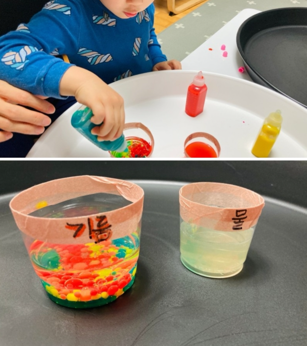 빈 컵 2개에 하나는 물을, 다른 하나는 식용유를 담아 준비하고, 아이들과 함께 각각의 컵에 물감액을 뿌려보는 간단한 놀이입니다. 물에 뿌리는 물감액들은 서서히 섞여가는 모습을 볼 수가 있고, 식용유에 뿌린 물감액은 섞이지 않고 동그란 물감 보석구슬들이 생기는 신기한 모습을 관찰 할 수가 있었습니다.