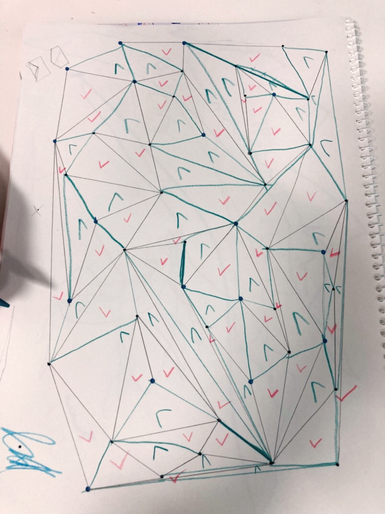 준비한 종이에 각자의 색깔펜으로 점들을 찍어 보았습니다. 그리고 가위, 바위, 보를 하여 이긴사람부터 먼저 점과 점을 연결하여 선을 긋기 시작하고 서로 번갈아가며 그어봅니다. (자로 그으면 더 반듯한 삼각형을 만들 수 있어요.) 마지막에 그은 선으로 생긴 삼각형을 해당 사람이 가져가는 게임방식입니다.