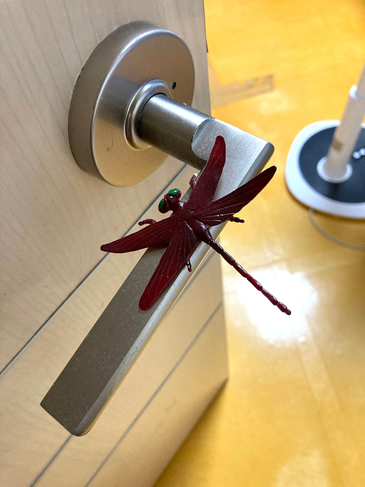 그렇게 한바탕 소동 후 잠자리에 들 시간. 안방과 작은방 손잡이에 어느 순간부터 잠자리 피규어가 다소곳이 놓여있었다. 아마, 아들이 샀던 곤충책 속 부록으로 있던 피규어들이었다.