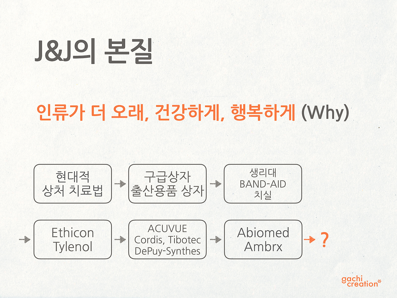존슨앤존슨은 소비자들에게 가장 친숙한 베이베오일로 시작한 회사가 아니다. 현대적 상처 치료법을 매뉴얼화해서 보급하고, 이에 필요한 도구를 제공하고 (구급상자, 출산용품, 반창고 등), 위생용품, (생리대, 치실), 약품 (타이레놀, 콘택트렌즈), 메디컬 도구와 기술 등을 연구개발과 인수합병을 통해 하나씩 축적하여 500조 원의 기업가치 평가를 받는 지금의 모습으로 진화해 왔다.
