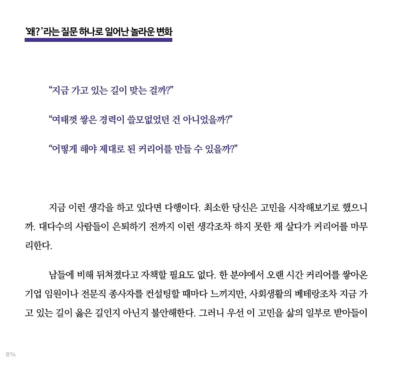 사람들은 그동안 살아온 삶에, 그리고 앞으로의 계획에 대한 불안감을 갖고 살아간다. 그래서 후회도 하고, 불안해한다. 인생의 큰 축인 커리어에 대한 확신이 부족할 때, 책에서는 나의 why를 찾아 선택과 계획의 기준으로 삼으라는 조언을 했다. 즉, 내가 일하는 목적, 추구하는 가치와 우선순위 등을 정의하고 이를 커리어 선택에 반영해야 한다는 이야기였다.