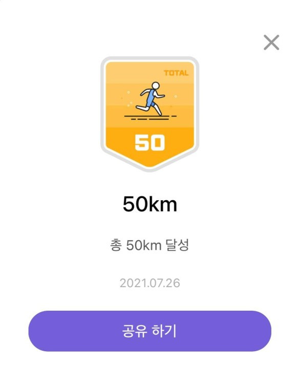 30분 초보 러너 프로그램 24회 중 15회를 채우고 나니 어느새 50km가 되었나 보다. 달리기는 일주일에 2~3회 정도, 다른 날들은 가벼운 걷기 운동을 20~30분 정도 하고 있으니, 실제 걷거나 달린 기록(걷기 운동할 때 5분 내외로는 달리기에 할애)은 50km보다는 더 될 것이다. 어플에서 기록도 측정해주고 목표하진 않았지만 아무튼 알면 기분 좋은 달성 기록을 짜잔-하고 공지해주니 고맙네. 바로 남편에게 공유했다 :)
