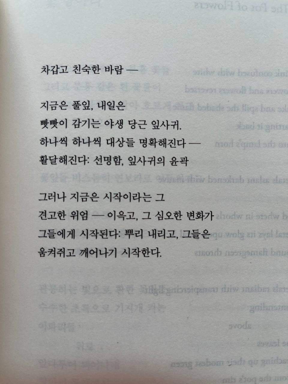책의 왼쪽 페이지에는 원문이, 오른쪽 페이지에는 번역이 실려있는 구성인데, 기회가 된다면 원문으로 읽어보시는 걸 꼭 추천한다. 1연에서 4연까지의 contagious, cold, waste, muddy, dried, standing and fallen, scattering, dead, leafless, lifeless, sluggish, dazed. 5연에서는 enter, naked, cold, familiar. 마지막 두 연에서는 now, tomorrow, defined, quickens, clarity, But, stark, entrance, profound, rooted, grip down, awaken 같은 단어들이 눈에 들어오고 마음에 남았다.