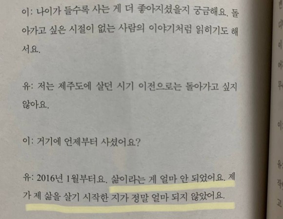 나는 스스로에 대해 참 무지했고, 스스로를 오해했다. 나 자신을 보다 정확하고 깊이 있게 알아가다 보니 마치 다시 태어난 기분이 드는 것이다. 그래서 위의 책에서 밑줄 친, "삶이라는 게 얼마 안 되었어요. 제가 제 삶을 살기 시작한 지가 정말 얼마 안 되었어요"라는 문장이 그렇게나 마음에 남는다. 그리고 그 시기 이전으로는 돌아가고 싶지 않다는 말도.