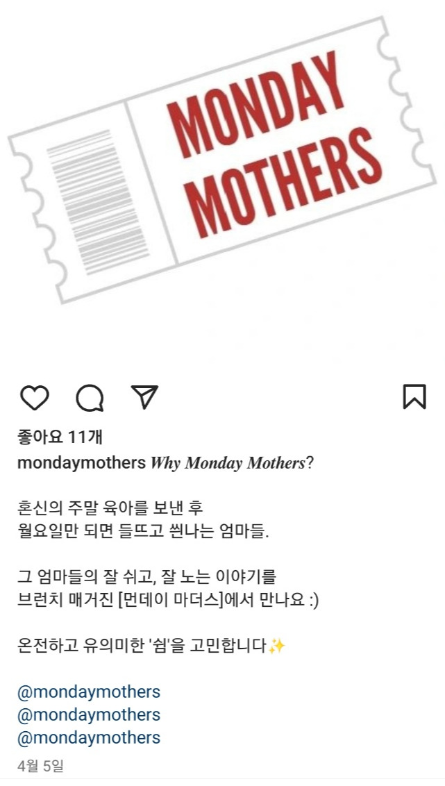월요일은.. 나만.. 미치게 신나는 날이었나? 이렇게 [먼데이 마더스 MONDAY MOTHERS] 매거진의 네이밍에 대해 먼지만한 후회가 밀려올 때 즈음 우리 매거진 필진 중 한 분인 솔트다움 님의 인스타그램에서 한 댓글을 보고 슬그머니 웃었다.