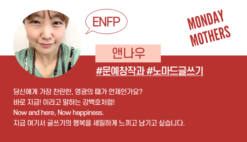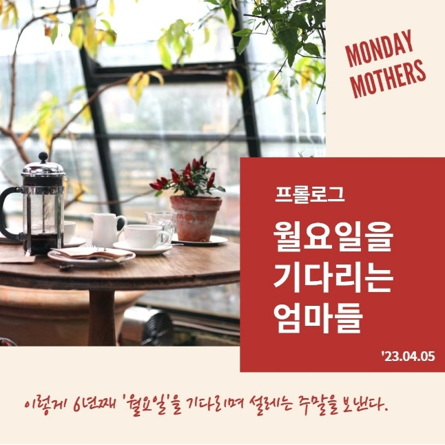 미술관에서 5년 내내 품고 있던 작은 소망 '미술 글쓰기'를 연습할 수 있는 장(場)이 먼데이 마더스다. (이너조이) 출간을 위한 집필 소재로 '쉼표 코칭'을 슬쩍 스케치해 보는 곳이 먼데이 마더스다. (솔트다움) 송도 엄마들의 토요 책 생각을 그대로 옮겨 놓는 '북클럽 노트'가 먼데이 마더스다. (오로시) 가을에 일산에서 오픈할 문학&영화 북클럽 멤버들을 떠올리며 쓰는 글이 먼데이 마더스다. (앤나우)