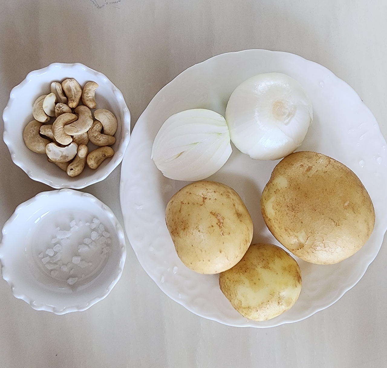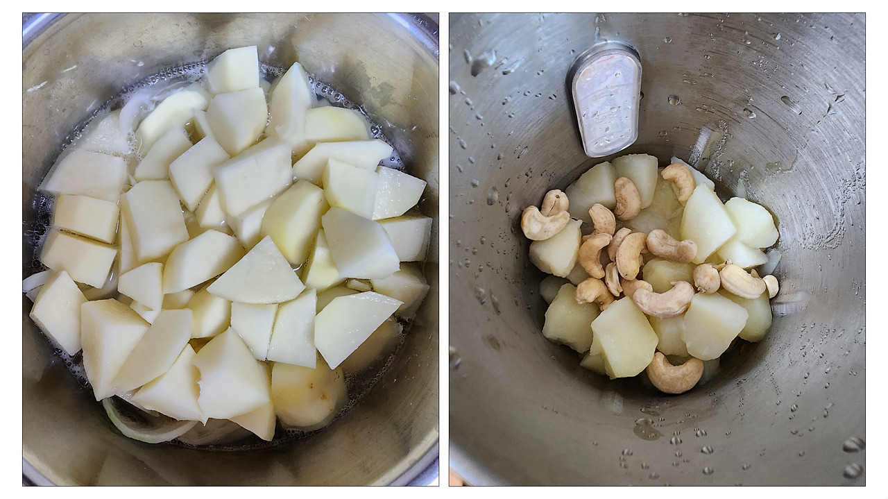 생캐슈너트를 미지근한 물에 불려놓고 양파와 감자는 깍둑 썰어 물을 자작하게 넣고 소금 간을 한 후 감자가 익을 때까지 삶아준다. 감자만 익으면 한 김 식힌 후 불려놓았던 생캐슈너트를 넣고 믹서기에 갈아주면 된다.
