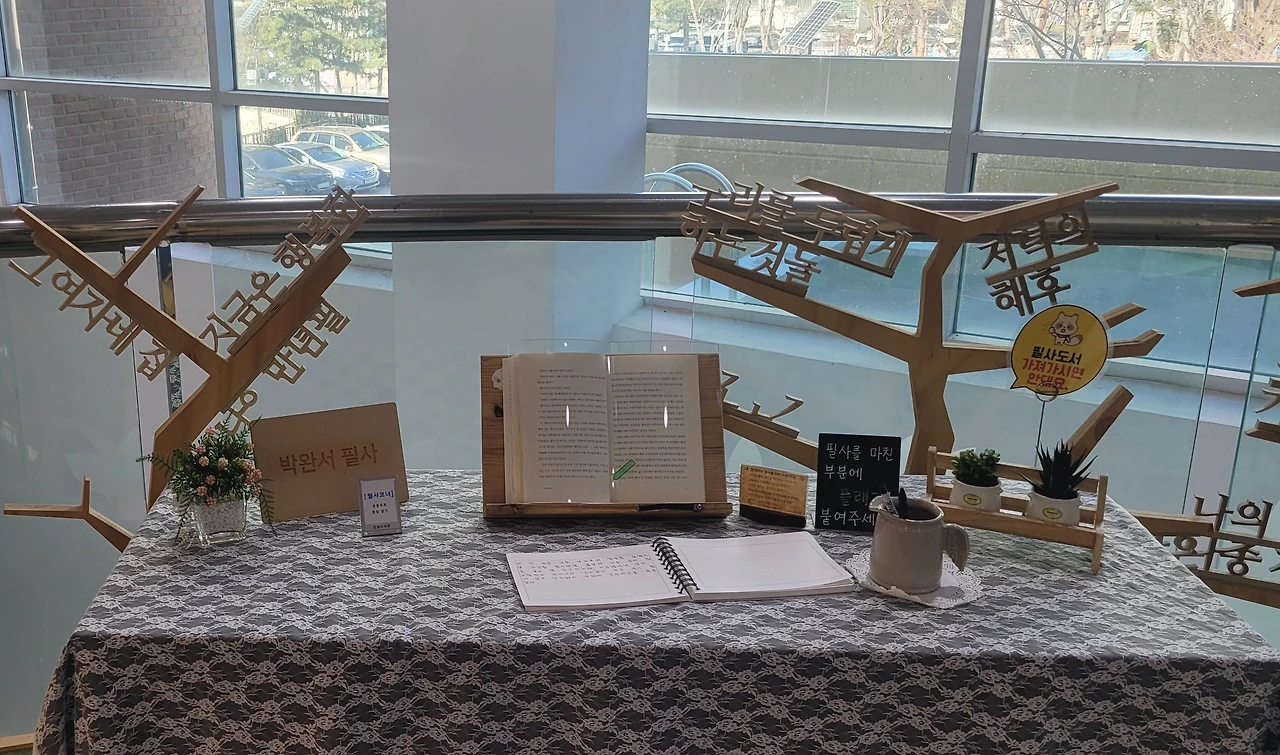 어쩔 수 없이 로비로 나와 이달의 필사 코너에 앉았다. 다행이었다. 원고지 한 칸 한 칸에 글자를 옮기다 보니, 슬픔은 지우개로 문지르듯 조금씩 사라졌다. 그렇다고 필사를 필사적으로 하지는 않았다. 솔직히 고백하자면, 나에게 필사란 문장을 음미하는 시간이라기보다 문장을 옮기는 노동에 가까웠다. 종이 한 장을 채우고 나면 늘 필사의 한계를 느끼곤 했다. 그런 의미에서 릴레이로 이어지는 공공의 필사는 내 몫의 숙제를 모르는 누군가에게 부담 없이 넘길 수 있어 좋았다.