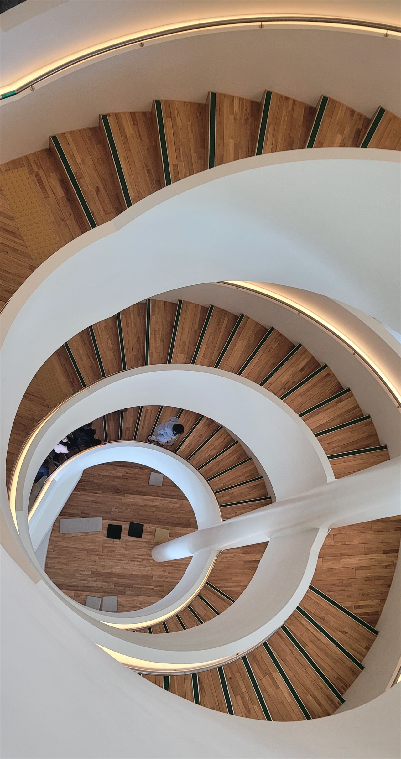 5층에서 내려다보니 또 다른 상상력이 발동되었다. 아래에서 볼 땐 달팽이였는데, 위에서 내려다보니 이번에는 영락없는 소라 한 마리였다. 나선형으로 휘감아 내려가는 모양새가 하도 신기해, 이쑤시개 같은 기둥을 쏙 뽑으면 나선형 계단이 소라 껍데기 속 알맹이처럼 줄줄이 딸려 올라올 것만 같았다.
