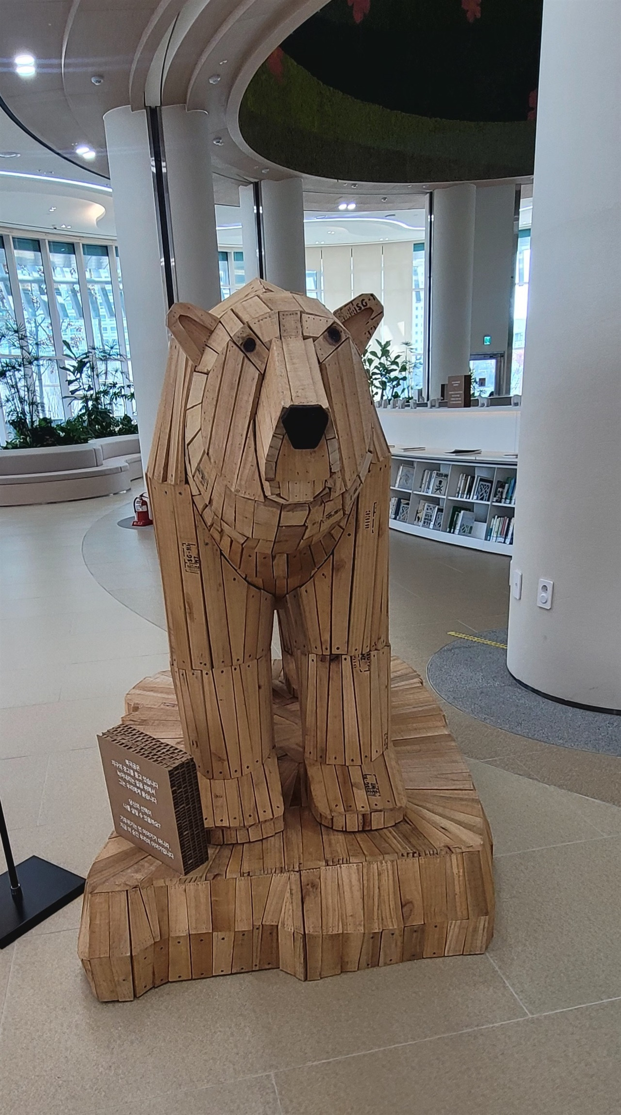 1층의 북극곰 조형물에서 시작된 메시지는 층을 오를수록 업사이클링 작품과 환경 전시로 변주되며 반복되고 있었다. 빙글빙글 도서관 나선형 계단과 벽면을 감싸고 있는 천연 이끼 '스칸디아모스'도 그 중 하나였다. 습도를 조절하고 공기를 정화하는 기능 덕분인지, 오래 머물렀음에도 실내 공기는 맑게 느껴졌다.