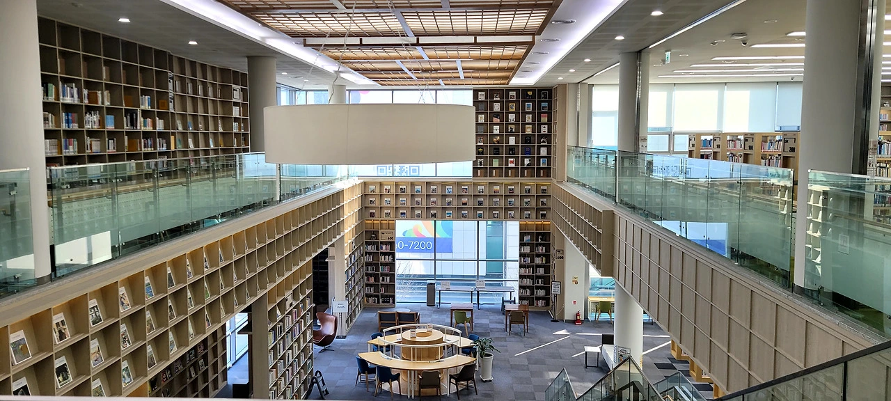 도서관 여행을 하며 심장 박동수가 가장 가파르게 올라가는 순간이 있다. 묵직한 도서관 문이 열리고 로비와 첫 대면을 하는 찰나다. 도서관의 규모가 웅장할수록 그 박동의 진폭은 더욱 커진다. 드디어 문을 열고 안으로 들어섰다. 높은 층고를 가득 채운 책의 모형들이 시야를 압도한다. 책의 세계로 오신 것을 환영한다는 메시지 같았다. 천장에는 책의 낱장 같기도, 혹은 투명한 기와 같기도 한 오브제들이 모빌처럼 매달려 반짝이고 있었다.