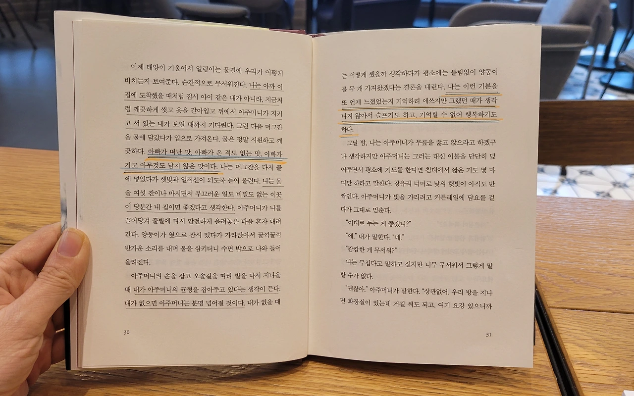 클레어 키건의 주옥같은 문장에 비하면 우리 4명이 함께 친 문장들은 너무 적다고 느껴집니다.모든 문장이 너무 좋아서 너무 많이 치면 책이 온통 밑줄로 가득 찰 것 같았습니다. 그래서 많이 아꼈습니다. 전체적인 서사를 놓치지 않으면서 문장에 집중하는 시간이 참 좋더군요. 왜 밑줄 독서를 하는지 이해할 수 있었습니다.한 권의 책을 함께 밑줄을 쳐서 읽으니 같은 집에 살아온 자매처럼 더 돈독해졌습니다.당분간 우리는 함께 밑줄을 긋기로 했습니다.
