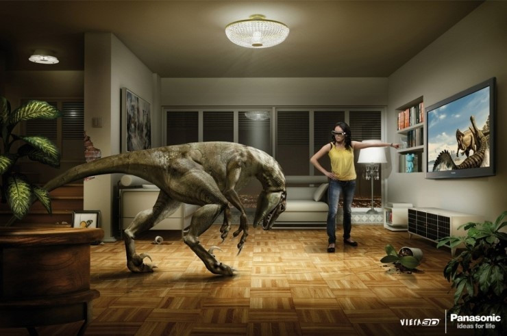 3D TV 속의 공룡이 뛰쳐나와 못된 강아지처럼 집에 있는 화분, 컵, 액자를 깨뜨린다면 어떨까? 그림에서처럼 당장 화면 안으로 들어가라고 호되게 꾸짖을 수도 있을 것이다. 만약 이렇게 가상 세계와 현실 세계의 경계를 허물 수 있다면 멋지고 예쁜 아이돌 그룹이 춤추며 노래하는 음악 방송이 시청률 1위를 기록할지도 모르겠다.
