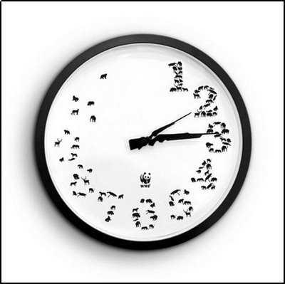 WWF의 광고를 하나 더 보자. 시계의 숫자를 자세히 보면 알 수 있듯이 시간이 흐를수록 동물들이 사라져 10시에 4마리, 11시에 1마리, 그리고 마지막 12시에는 모든 동물이 사라지게 된다. 아직은 2시 15분이라 다소 여유가 있지만 조금만 더 시간이 흐르면 멸종의 속도는 급격히 증가하게 된다. WWF의 표어처럼 ‘너무 늦기 전에 Before it’s too late’ 위험에 처한 야생 동물들에게 관심을 기울여야 하겠다.