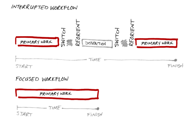 요약하면, 일하는 단계를 줄이기 위해 유사한 작업들을 모으고, 각 단계별로 그 작업들을 몰아서 처리하면 훨씬 빠르게 할 수 있다. 멀티태스킹 Multitasking을 하면 얼핏 일을 잘 하는 것처럼 보이지만, 오히려 생산성을 좀 먹는다.