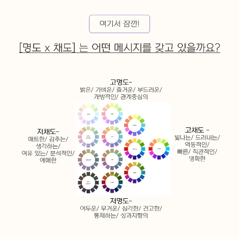 누구나 공감하겠지만 컬러가 밝으면 훨씬 더 부드럽고 개방적이고 다른 사람과의 소통에 적극적일 거라고 기대하죠. 어두운색은 고등학교 때 교복을 생각해보면 이해가 될 거예요. 어딘지 모르게 통제받는 느낌을 받죠. 옷의 질감은 시각적으로 확인하기 어렵지만 컬러는 멀리 떨어져 있어도 구분할 수 있어요. 상담을 받는 분들에게 잘 맞는 명도와 채도를 알려드리는데 신기하게도 이 톤이 잘 맞을수록 그 톤이 가진 메시지와 그 사람의 성향이 거의 일치해요.