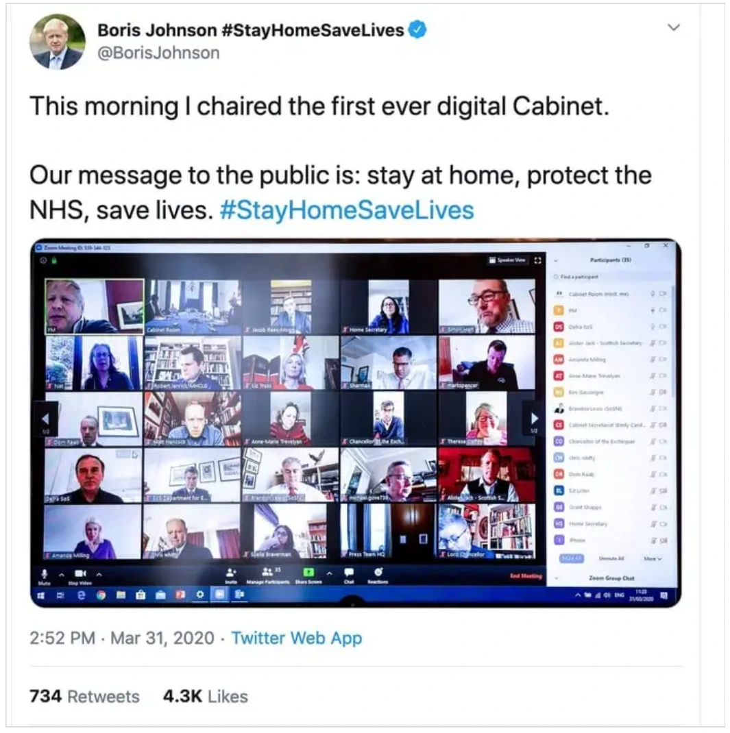 영국 보리스 총리 줌을 활용한 디지털 회의; 출처: 보리스 총리 트위터 계정