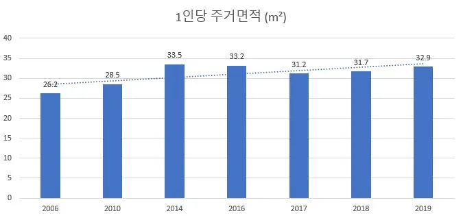 2020년 6월 국토교통부가 발표한 [주거실태조사 결과]에 따르면 1인당 주거면적은 ‘19년 32.9제곱미터로 ’18년(31.7제곱미터) 대비 소폭 증가하였다.