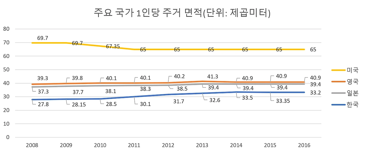 1인당 평균 주거 면적은 물리적 주거밀도를 비교할 수 있는 지표로, 주거의 질을 의미한다고 볼 수 있다. 간단히 말해 가구가 사용하는 주거 면적을 가구원수로 나눈 값을 1인당 주거 면적이라고 보면 된다. 국토교통부에서 주거실태조사를 하는데 우리나라는 1인당 주거면적이 늘어나고 있는 추세를 보이고 있다. 주요 OECD 국가와 비교하더라도 아직 최하위이지만 계속해서 증가하는 추세를 확인할 수 있다. 영국과 일본은 약 40제곱미터의 1인당 주거면적을 갖고 있고 미국은 약 65제곱미터의 주거면적을 갖고 있다.