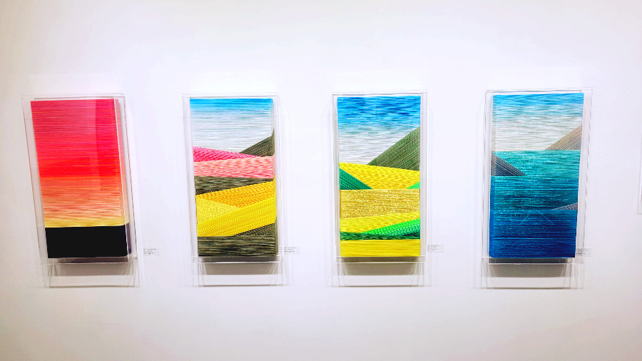 캔버스를 채운 것은 붓질이 아니라 실이었다. 한 올 한 올 세밀하게 배치된 무수한 실들이 만들어낸 색채의 교향곡. 물감으로 여겼던 매끄러운 색면은 실상 수천 가닥의 실이 만든 시각적 착시였다. 근거리에서 관찰하자 실의 미세한 질감과 광택, 실 사이 틈새가 드리운 그림자까지—평면으로 인식했던 작품은 촉각적 깊이를 지닌 입체 구조물이었다.