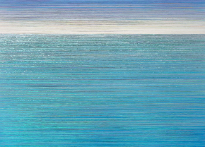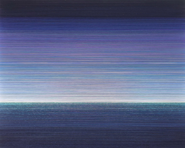 인사동 골목을 걷다 우연히 한 갤러리에 걸린 작품을 보게 되었다. 호기심에 갤러리에 입장하였고 그렇게 한 작가의 작품을 마주하게 되었다. 벽면에 걸린 작품들은 멀리서 보면 섬세한 그라데이션의 추상화였다. 짙은 남색에서 보라로, 청록에서 아쿠아로 자연스럽게 스며드는 색의 변화. 수백, 수천 개의 반듯한 수평선들이 캔버스를 가득 메우고 있었다. 거의 기계적일 정도로 정밀한 획들. 이건 작가의 완벽주의일까, 아니면 선에 대한 강박적 집착일까?