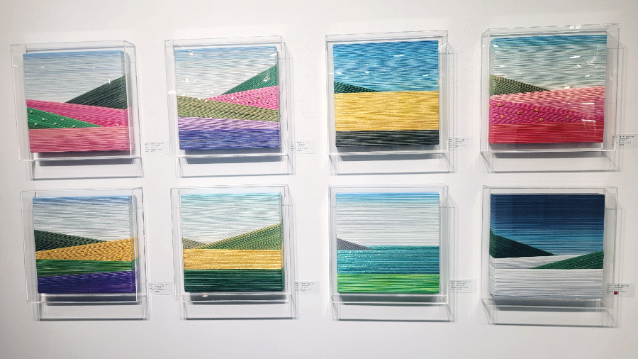 기법적으로 섬세하게 배열된 실의 선들이 만드는 촘촘한 수평선, 갑작스러운 전환 없이 은은하게 스며드는 색상의 점진적 변화, 실의 광택이 빛을 받아 미묘하게 변화하는 표면의 빛의 반사성, 여러 층의 실이 쌓이며 만드는 투명성과 중첩이 돋보인다.