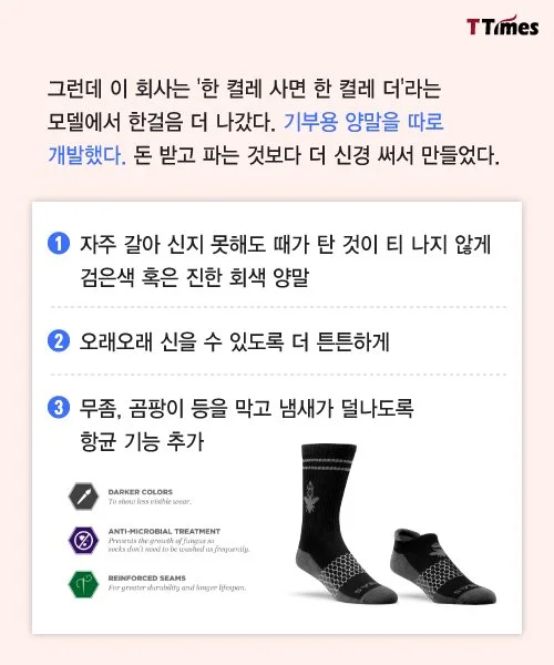 당시 톰스 슈즈(https://brunch.co.kr/@innovationlab/5)가 선풍적인 인기와 대중의 주목을 받은 시기였는데 David Heath와 Randy Goldberg는 톰스 슈즈의 박애적인 미션에 공감하며 판매되는 양말 1켤레 당 양말 1켤레를 제3국이 아닌 자국의 노숙자들에게 무료로 기부하기로 하였다.